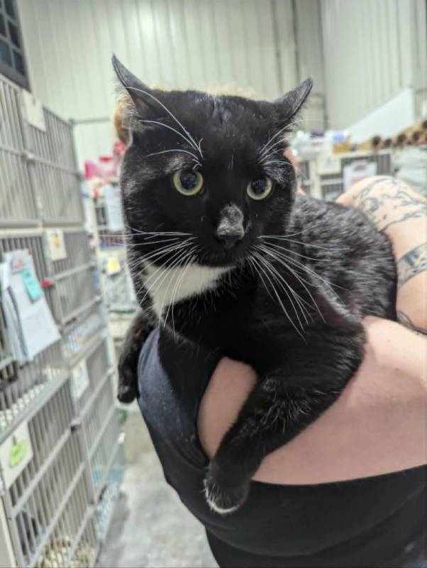 Kaos est un beau petit chat avec le nez en cœur, qui a malheureusement été ramené après une première tentative d’adoption.