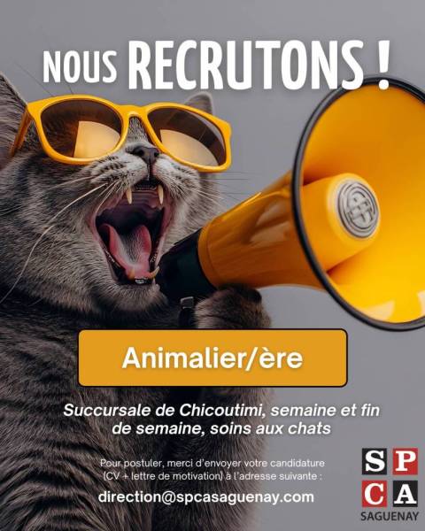 Nous sommes à la recherche d’un animalier à temps plein pour la succursale de Chicoutimi pour venir prendre soin des minous!